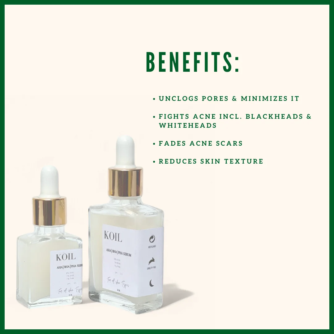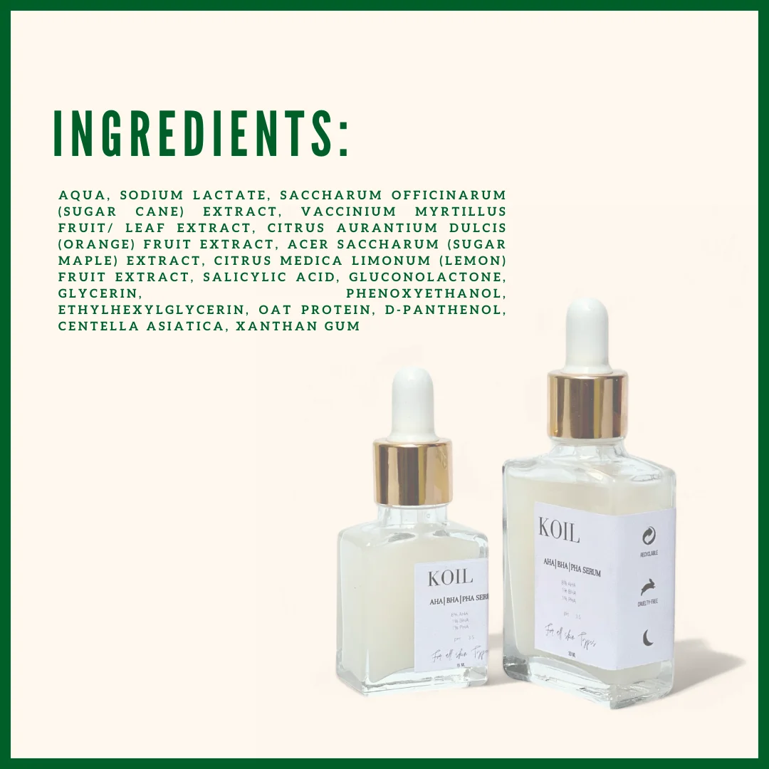 Our 10% AHA BHA PHA Serum is expertly crafted with 8% fruit-based AHA, 1% BHA, and 1% PHA, along with Centella Asiatica, Natural Moisturizing Factors, and Oat Protein to exfoliate, unclog pores, and deeply hydrate—without irritation.