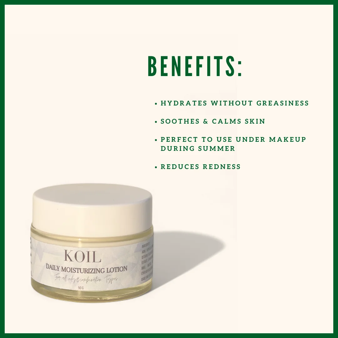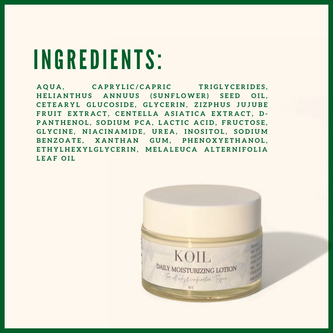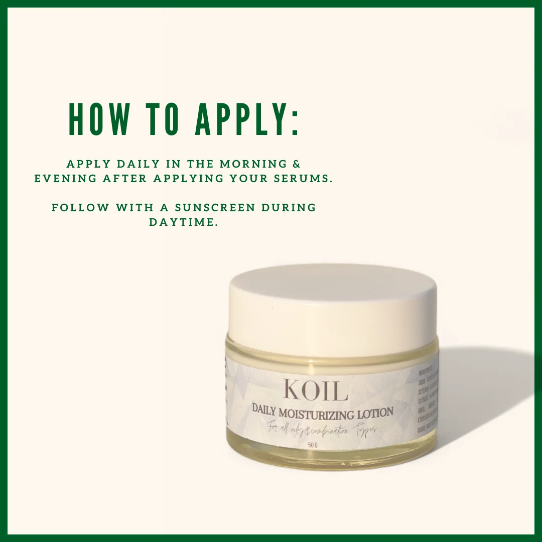 Our Daily Moisturizing Lotion has a lightweight, fast-absorbing formula designed to deliver deep hydration without heaviness or greasiness. Infused with Niacinamide, Centella Asiatica, and Panthenol, this skin-loving blend helps restore moisture, strengthen the skin barrier, and keep your complexion soft, smooth, and radiant all day long.